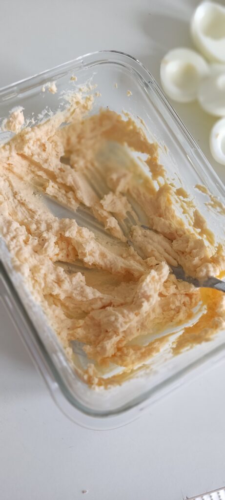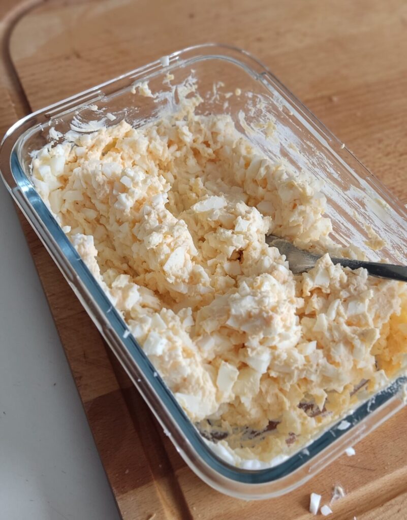 Przekrój jajka na pół i przełóż żółtka do pojemnika. Dodaj 2 łyżki majonezu i rozgnieć wszystko widelcem, aż powstanie gładka pasta. Dodaj odrobinę soli i pieprzu do smaku. Pasta z żółtek będzie naszą bazą.