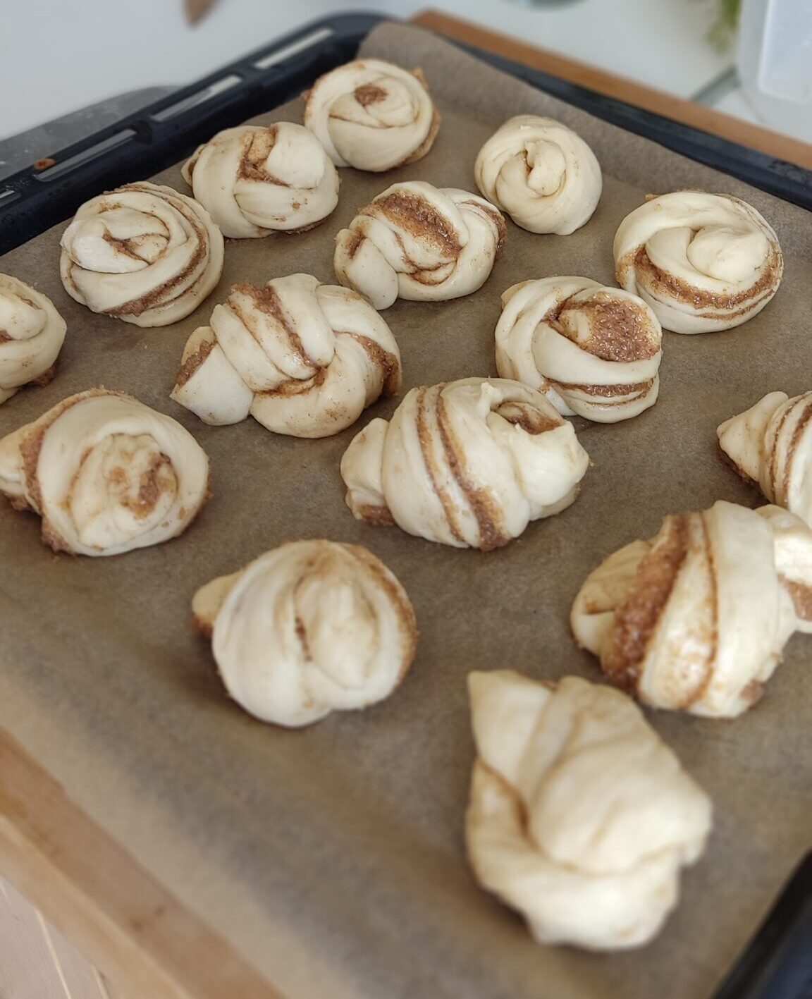 Układamy cynamonki na blaszce wyłożonej papierem do pieczenia, przykrywamy ściereczką i zostawiamy na 30 minut, by podrosły.