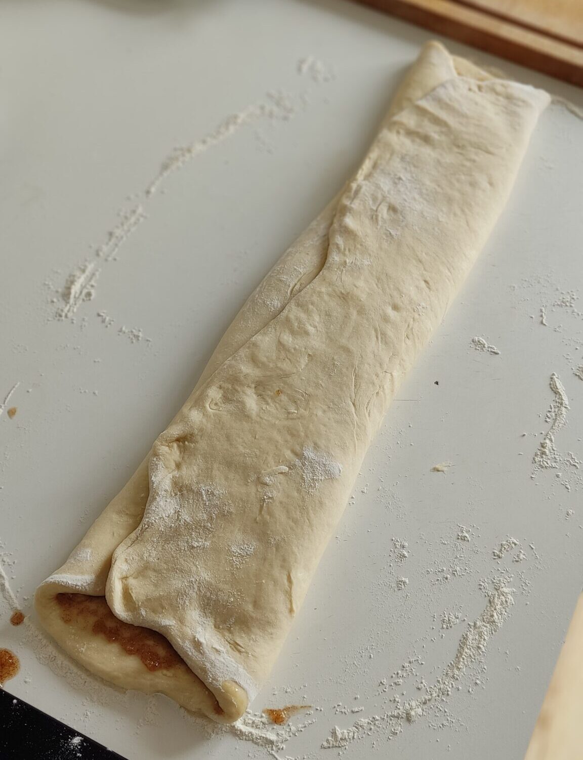 Gdy ciasto wyrośnie, rozwałkowujemy je w podłużny prostokąt o grubości około 5 mm, a następnie smarujemy całość przygotowanym nadzieniem.